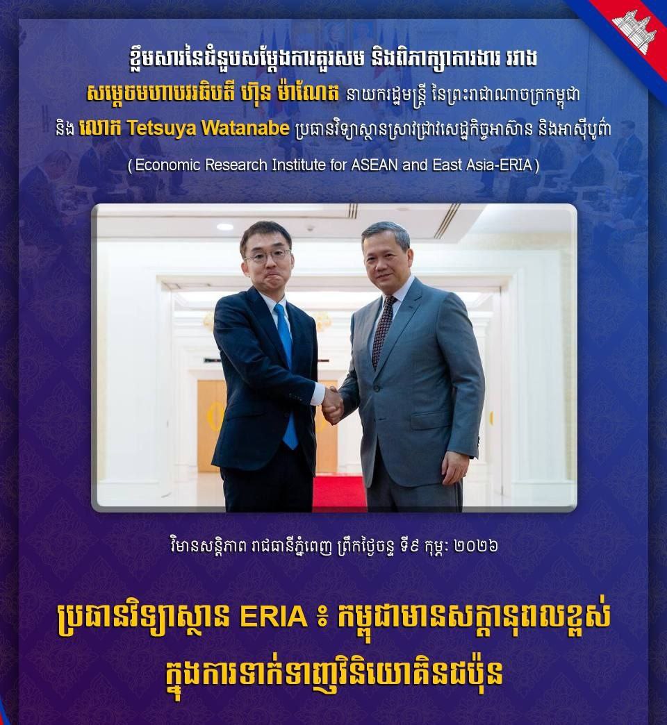 នាព្រឹកថ្ងៃទី៩ ខែកុម្ភៈ ឆ្នាំ២០២៦ សម្ដេចមហាបវរធិបតី ហ៊ុន ម៉ាណែត នាយករដ្ឋមន្ត្រី នៃព្រះរាជាណាចក្រកម្ពុជា បានអនុញ្ញាតឱ្យលោកសាស្ត្រាចារ្យ តេតស៊ូយ៉ា វ៉ាតាណាបេ (Tetsuya WATANABE) ប្រធានវិទ្យាស្ថានស្រាវជ្រាវសេដ្ឋកិច្ចសម្រាប់កិច្ចការអាស៊ាន និងអាស៊ីបូព៌ា (ERIA) ចូលជួបសម្ដែងការគួរសម និងពិភាក្សាការងារ នៅវិមានសន្ដិភាព។