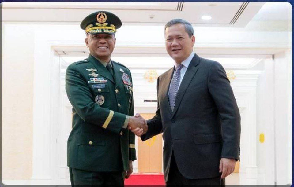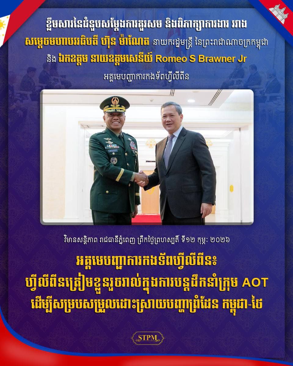 នាព្រឹកថ្ងៃទី១២ ខែកុម្ភៈ ឆ្នាំ២០២៦, សម្ដេចមហាបវរធិបតី ហ៊ុន ម៉ាណែត នាយករដ្ឋមន្ត្រី នៃព្រះរាជាណាចក្រកម្ពុជា បានអនុញ្ញាតឱ្យឯកឧត្តម នាយឧត្តមសេនីយ៍ Romeo S. Brawner Jr. អគ្គមេបញ្ជាការកងទ័ពហ្វីលីពីន ចូលជួបសម្ដែងការគួរសម និងពិភាក្សាការងារ នៅវិមានសន្ដិភាព។