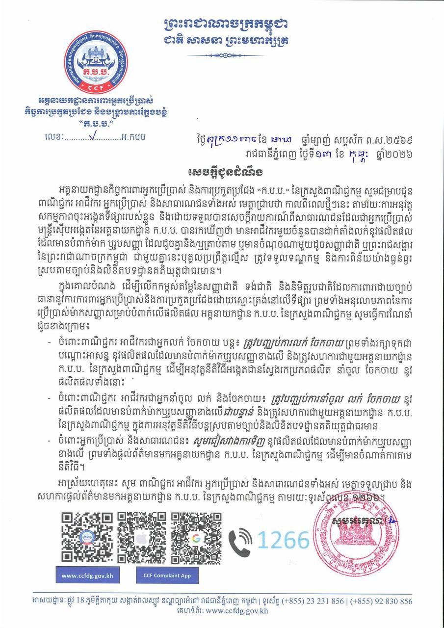 ចំពោះអ្នកប្រើប្រាស់ និងសាធារណជន៖ សូមជៀសវាងការទិញ នូវផលិតផលដែលមានបំពាក់ម៉ាកឬរូបសញ្ញា ខាងលើ ព្រមទាំងផ្តល់ព័ត៌មានមកអគ្គនាយកដ្ឋាន ក.ប.ប. នៃក្រសួងពាណិជ្ជកម្ម ដើម្បីមានចំណាត់ការតាម នីតិវិធី។