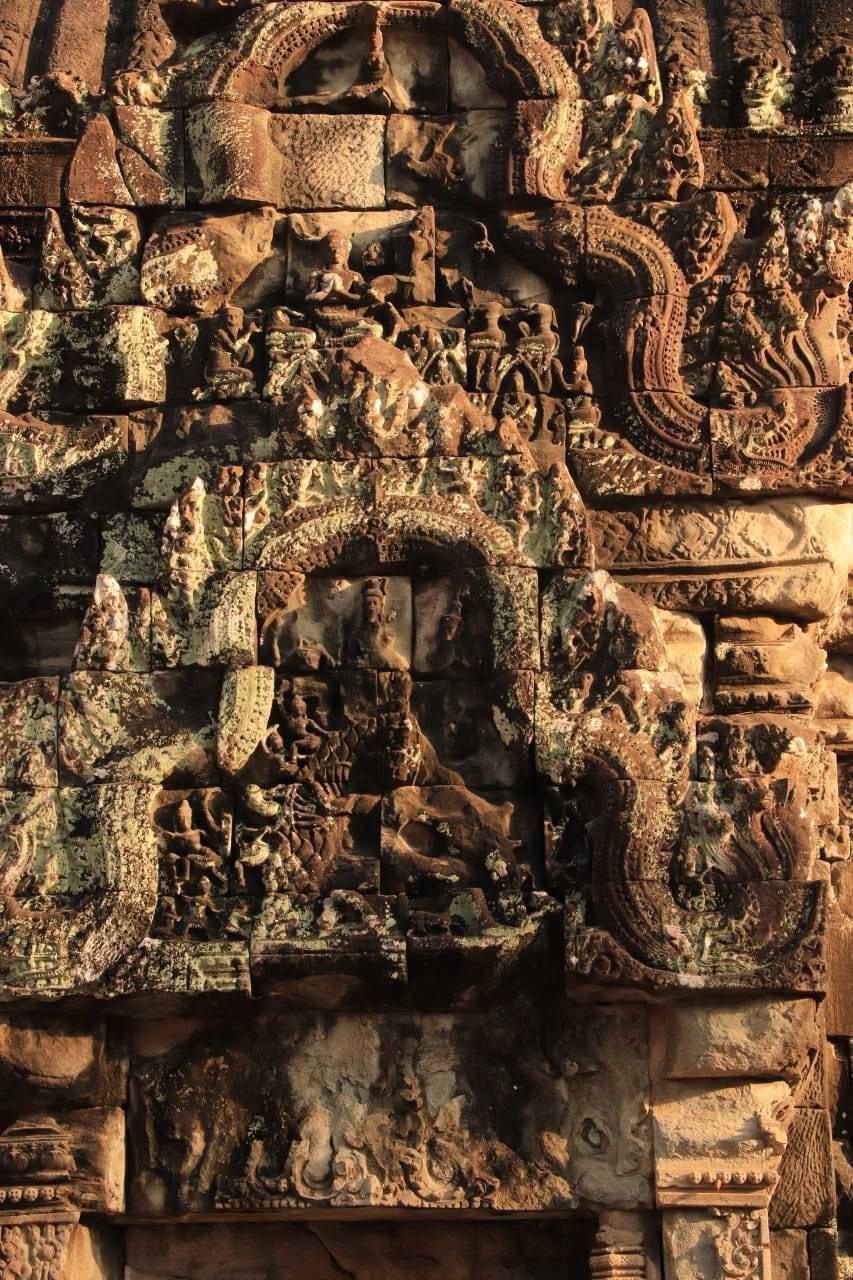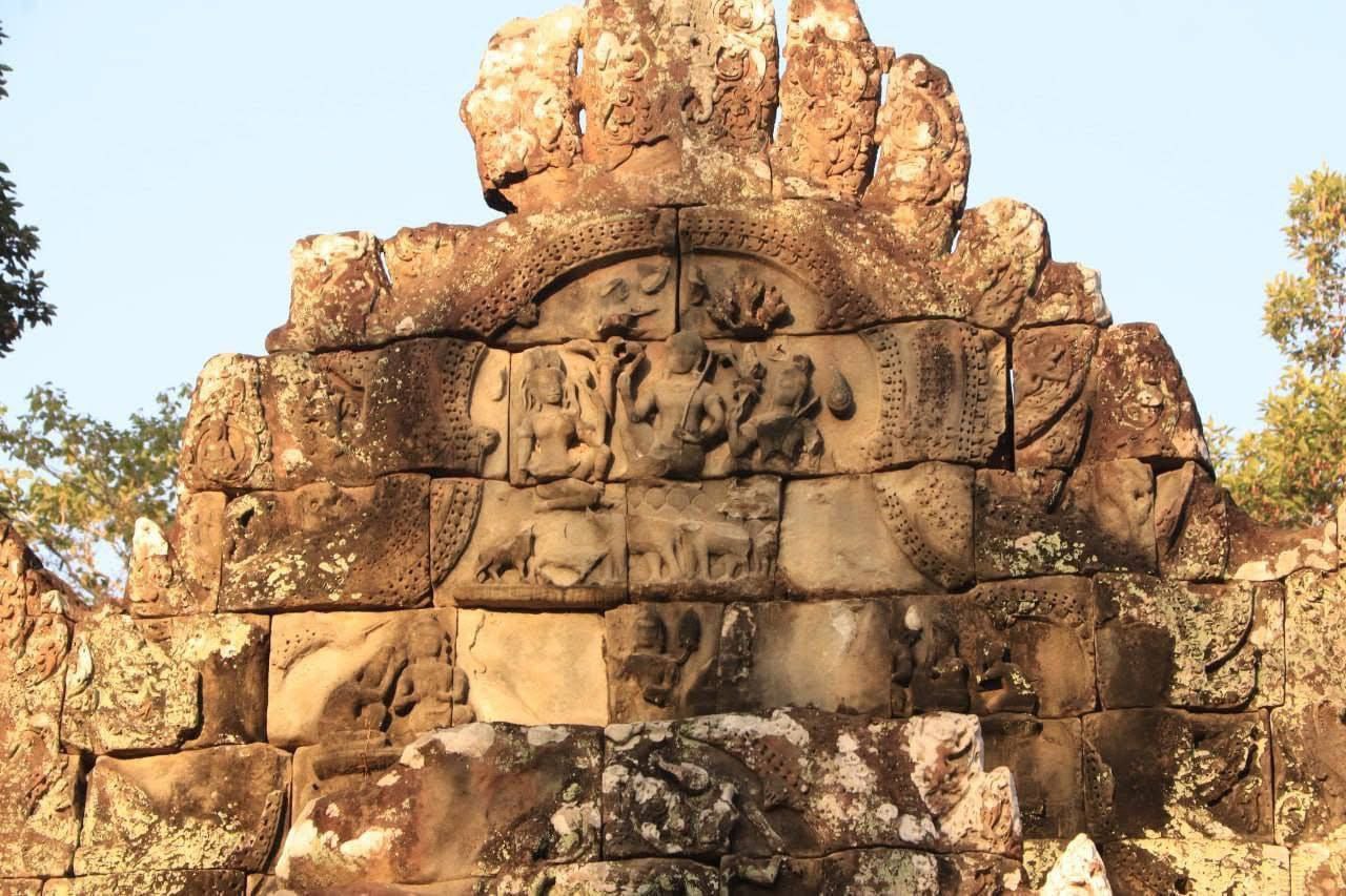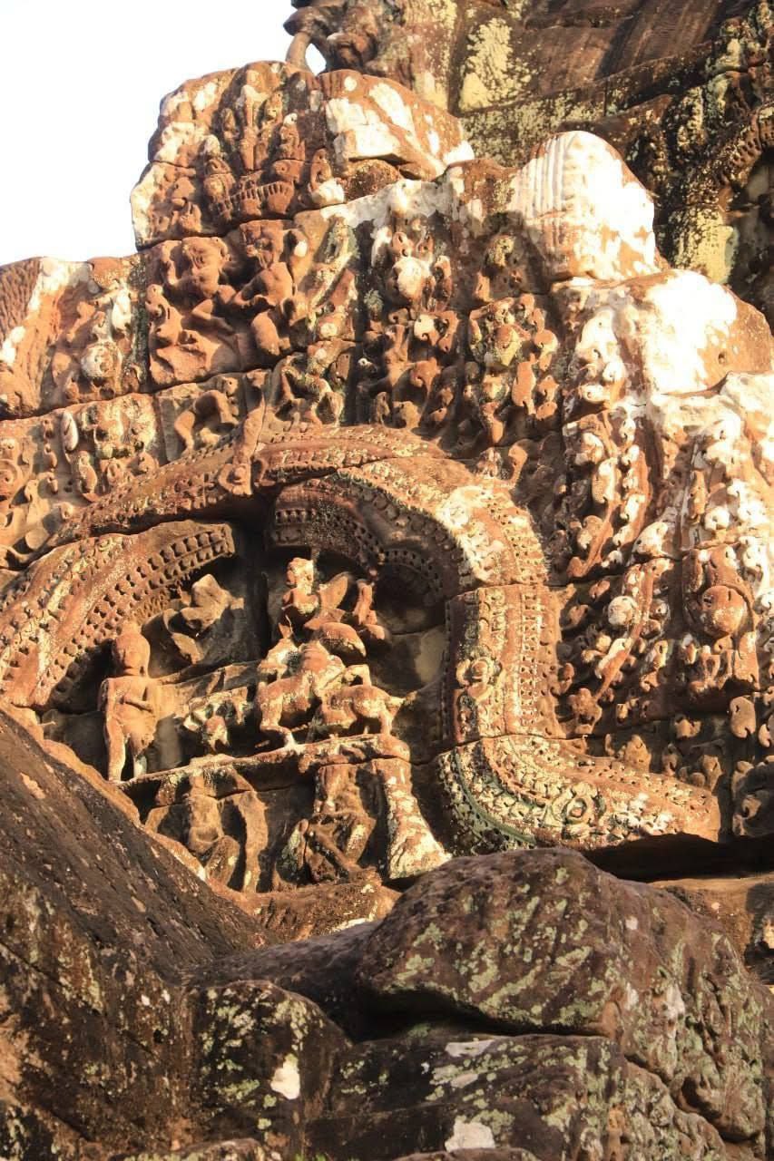 តួកណ្តាលមានលក្ខណៈពិសេស ដោយមានយ៉៤ ដែលខាងកើតបើកជាច្រកចូលសំខាន់ រីឯយ៉៣ទៀតបិទដោយទ្វារបញ្ឆោត។ នៅលើទ្វារបញ្ឆោតនៃយ៉ទាំង៣នេះ មានចម្លាក់ល្អវិចិត្រ និងអមដោយចម្លាក់ទេវតាជាច្រើនដូចនឹងប្រាសាទអង្គរវត្តដែរ។ ផ្តែរលើខ្លោងទ្វារខាងកើតមានចម្លាក់ជាពិសេសព្រះនារាយណ៍គង់លើជំនិះគ្រុឌ។ នៅលើហោជាងខាងត្បូងនៃមណ្ឌប មានចម្លាក់រឿងព្រះឥសូរគង់ធ្វើតាបសនៅភ្នំមួយ ដែលត្រូវក្រុងរាពណ៍អង្រួនរំខាន តែព្រះអង្គចុចចុងម្រាមជើងចុះដីសង្កត់ក្រុងរាពណ៍មិនឱ្យរើខ្លួនរួច។ ក្រៅពីនេះ មានចម្លាក់រឿងរាមកេរ្តិ៍ជាច្រើនកន្លែងទៀត បង្ហាញនៅតាមផ្តែរនិងហោជាងផ្សេងទៀត៕