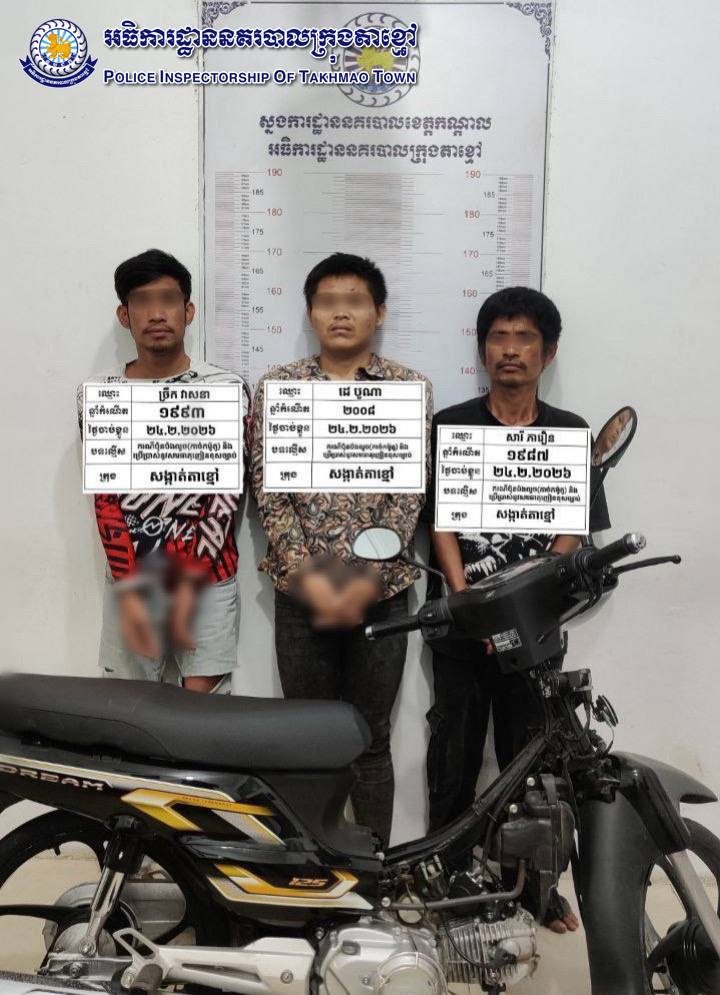 (ក្រុងតាខ្មៅ) ដោយអនុវត្តតាមបទបញ្ជារបស់ លោកឧត្តមសេនីយ៍ទោ ឈឿន សុចិត្ត ស្នងការ នៃស្នងការដ្ឋាននគរបាលខេត្តកណ្តាល នៅថ្ងៃទី២៤ខែកុម្ភៈឆ្នាំ២០២៦ កម្លាំងនគរបាលព្រហ្មទណ្ឌ ក្រុមល្បាតអន្តរាគមន៍ ដឹកនាំបញ្ជាដោយលោកវរសេនីយ៍ឯក យី វណ្ណដា អធិការនគរបាលក្រុងតាខ្មៅ ល្បាតប្រដេញបង្ក្រាបឃាត់នៅចំណុច រង្វង់មូលព្រែកសំរោងភូមិព្រែកសំរោង សង្កាត់តាខ្មៅក្រុងតាខ្មៅ ខេត្តកណ្តាល ឃាត់ខ្លួនជនសង្ស័យចំនួន៣នាក់ ១-ឈ្មោះដេ បូណា ភេទប្រុស អាយុ ១៨ ឆ្នាំ ជនជាតិខ្មែរ មានទីលំនៅភូមិទួលរកា សង្កាត់ចាក់អង្រែក្រោម ខណ្ឌមានជ័យ រាជធានីភ្នំពេញ ២-ឈ្មោះសារី ភារឿន ភេទប្រុស អាយុ៣៨ឆ្នាំ ជនជាតិខ្មែរ រស់នៅភូមិគគីធំ ឃុំគគីធំ ស្រុកកៀនស្វាយ ខេត្តកណ្តាល ៣-ឈ្មោះច្រឹក វាសនា ភេទប្រុស អាយុ៣២ឆ្នាំ ជនជាតិខ្មែរ រស់នៅភូមិកំពង់ពោធិ៍ ឃុំកំពង់ភ្នំ ស្រុកកៀនស្វាយ ខេត្តកណ្តាល ។ ជនសង្ស័យទាំង០៣នាក់ គ្មានមុខរបរពិតប្រាកដ វិជ្ជមាននូវសារធាតុញៀន(+) ។