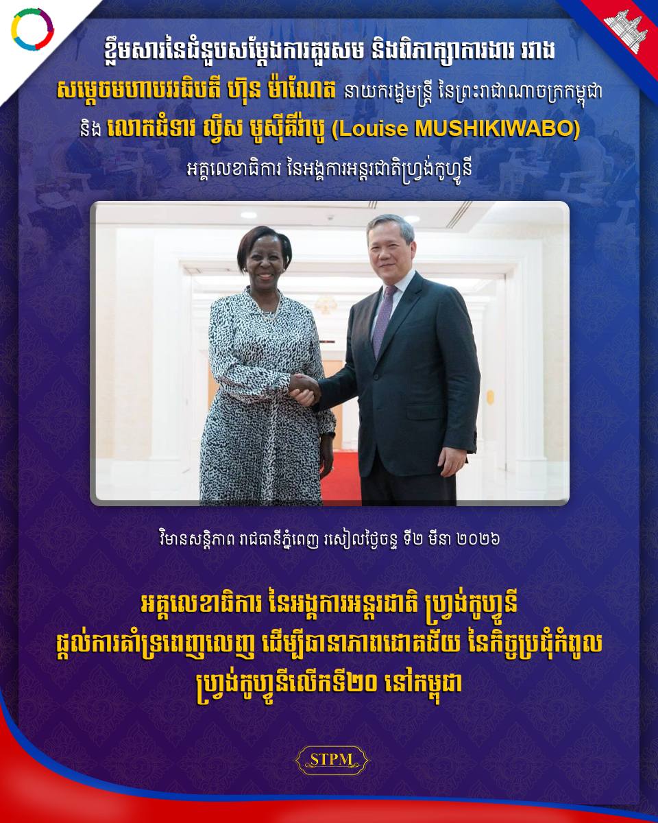 នារសៀលថ្ងៃទី២ ខែមីនា ឆ្នាំ២០២៦, សម្ដេចមហាបវរធិបតី ហ៊ុន ម៉ាណែត នាយករដ្ឋមន្ត្រី នៃព្រះរាជាណាចក្រកម្ពុជា បានអនុញ្ញាតឱ្យលោកជំទាវ ល្វីស មូស៊ីគីវ៉ាបូ (Louise MUSHIKIWABO) អគ្គលេខាធិការនៃអង្គការអន្តរជាតិហ្វ្រង់កូហ្វូនី និង គណៈប្រតិភូ ចូលជួបសម្ដែងការគួរសម និងពិភាក្សាការងារ នៅវិមានសន្ដិភាព។