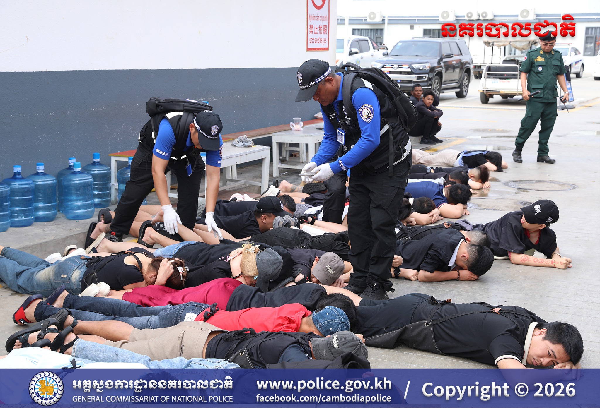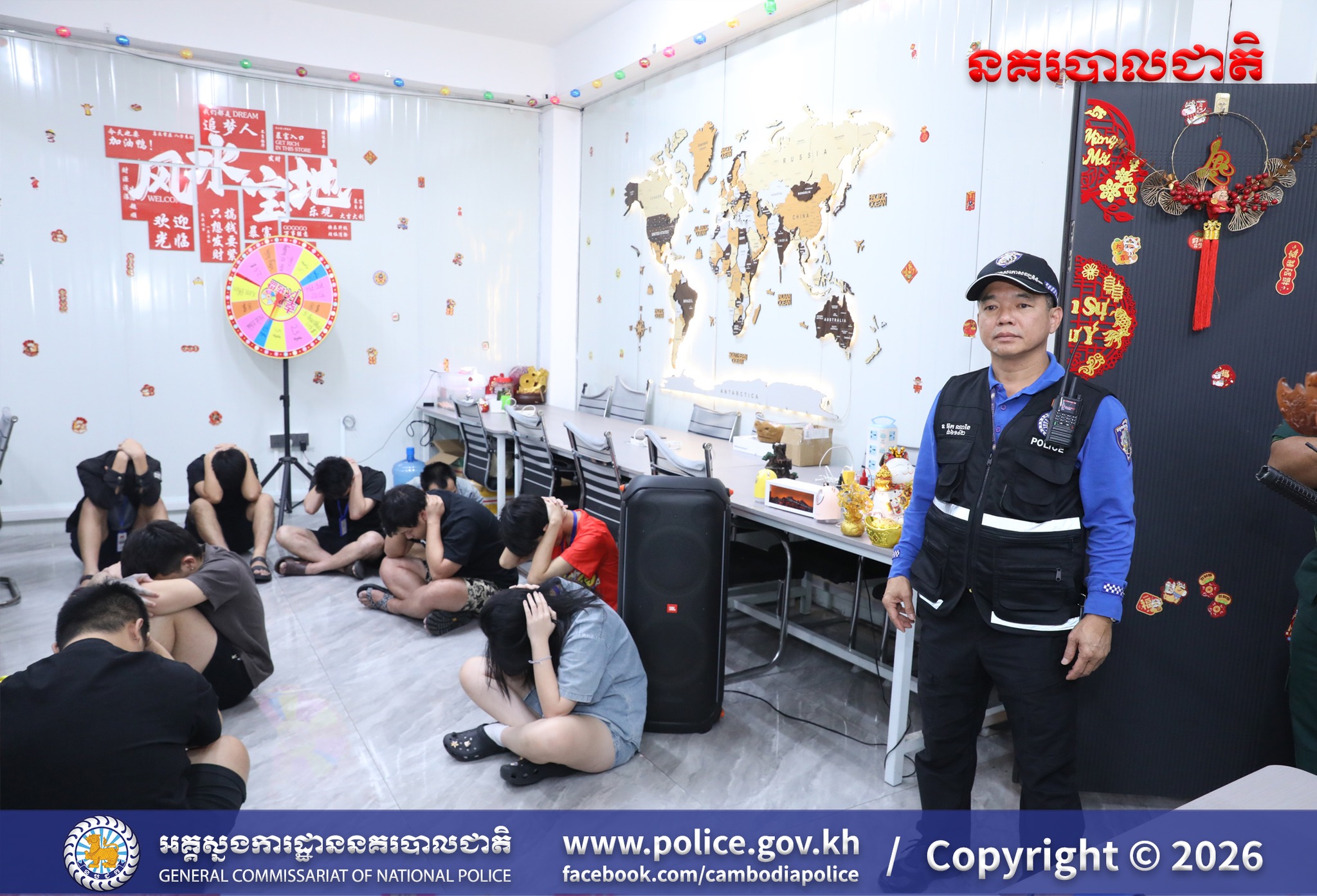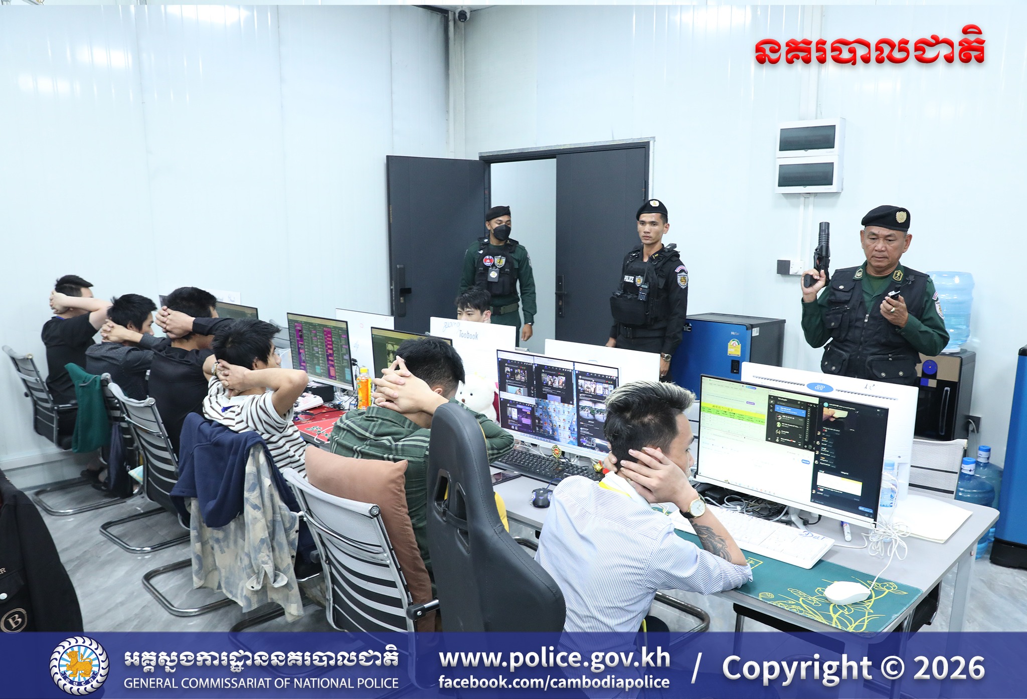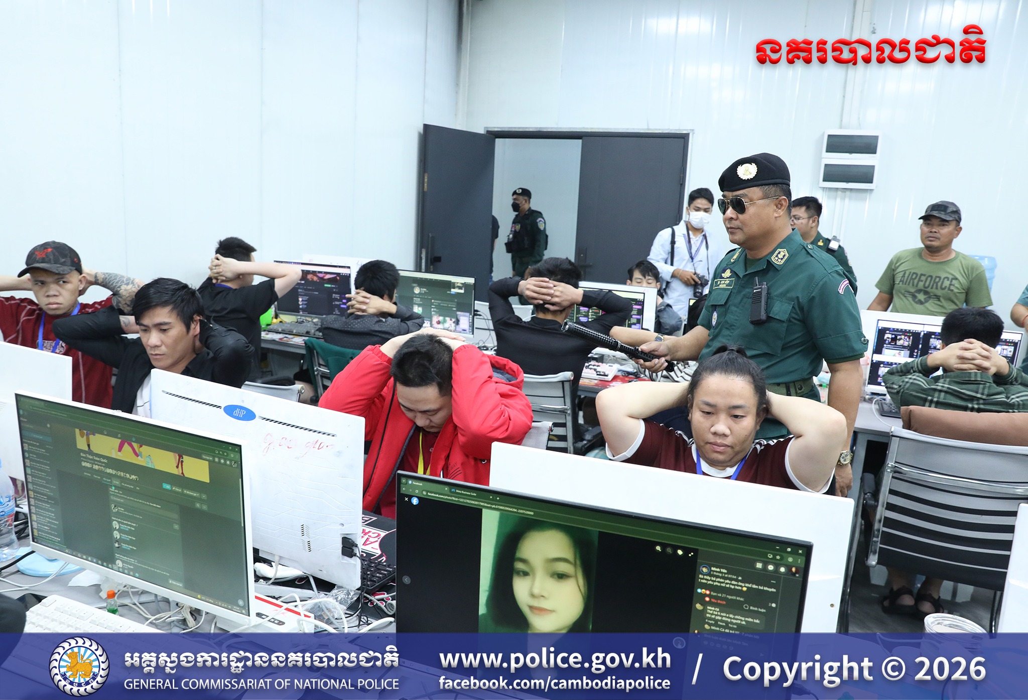 (បន្ទាយមានជ័យ) ៖ ​អនុវត្តបទបញ្ជាដ៏ខ្ពង់ខ្ពស់ពី ឯកឧត្តម នាយឧត្តមសេនីយ៍ ស ថេត អគ្គស្នងការនគរបាលជាតិ នៅថ្ងៃទី១២ ខែមីនា ឆ្នាំ២០២៦ ឯកឧត្តម ឧត្តមសេនីយ៍ឯក ជីវ ផល្លី និង ឯកឧត្តម ឧត្តមសេនីយ៍ឯក មួង សុធា អគ្គស្នងការរងនគរបាលជាតិ បានសហការជាមួយ ឯកឧត្តមអភិបាលរងខេត្ត និងដឹកនាំសម្របសម្រួលនីតិវិធីដោយលោកព្រះរាជអាជ្ញារង នៃអយ្យការអមសាលាដំបូងខេត្ត បានដឹកនាំកងកម្លាំងចុះបង្រ្កាបទីតាំងបទល្មើសឆបោកតាមប្រព័ន្ធបច្ចេកវិទ្យា (Online Scams) ឈ្មោះឆាយណាបឹងបេង ស្ថិតនៅភូមិអូរអំពិល ឃុំទួលពង្រ ស្រុកម៉ាល័យ ខេត្តបន្ទាយមានជ័យ រកឃើញភស្តុតាង និងជនបរទេសមួយចំនួន កំពុងបន្តប្រតិបត្តិការតាមនីតិវិធី៕