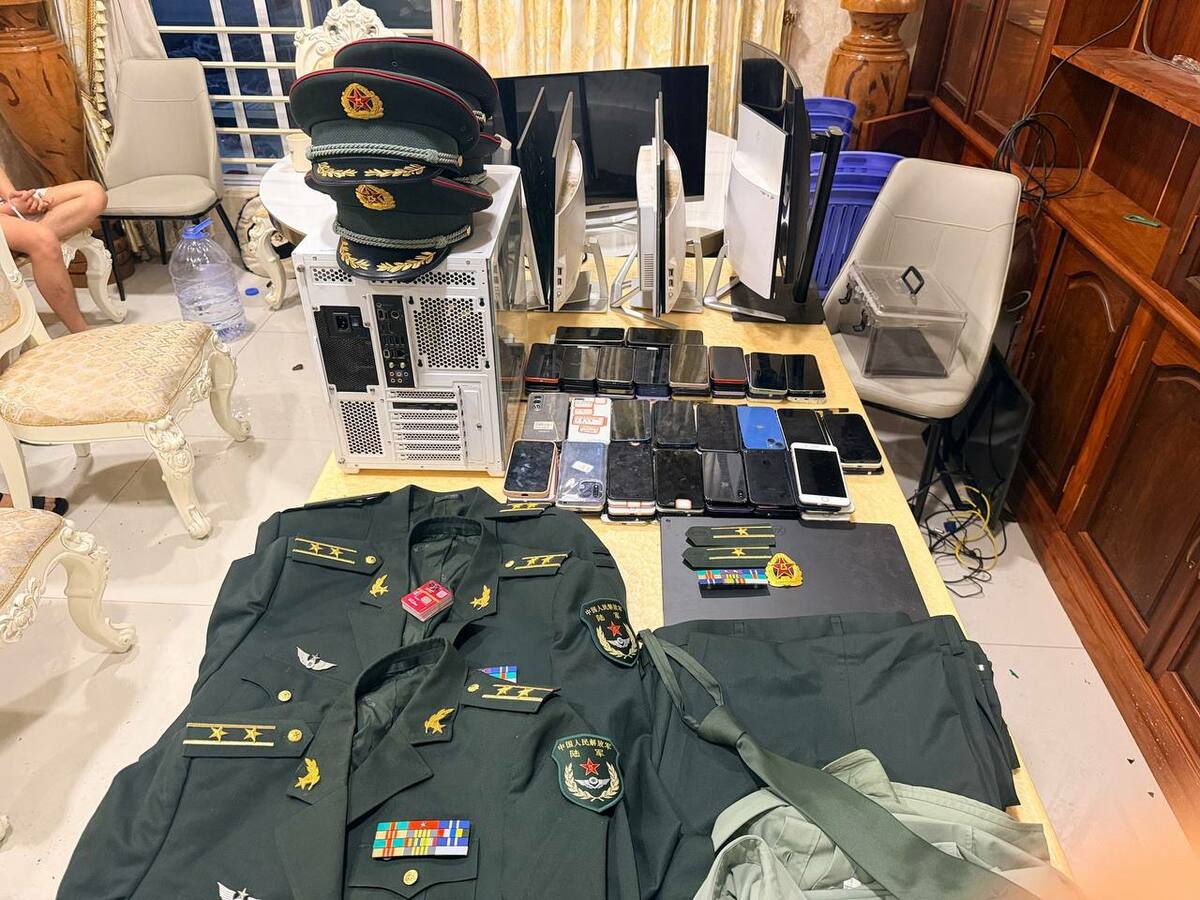 (ភ្នំពេញ)៖ កម្លាំងចម្រុះ នៃគណៈបញ្ជាការឯកភាពរដ្ឋបាលរាជធានីភ្នំពេញ បានបន្តប្រតិបត្តិការចុះ បង្ក្រាប ការឆបោកតាមប្រព័ន្ធបច្ចេកវិទ្យា online Scams មួយកន្លែង ស្ថិតក្នុងបុរីប៉េងហួតបឹងស្នោ ផ្ទះលេខ១៤ ផ្លូវ M០៥ ភូមិបឹងឈូក សង្កាត់និរោធ ខណ្ឌច្បារអំពៅ ឃាត់ជនជាតិចិន១៩នាក់ និងដកហូតសម្ភារៈភស្តុតាងរួមាន: ទូរសព្ទដៃ ១២៣គ្រឿង, កុំព្យូទ័រ All in One ០៨ គ្រឿង, ម៉ូនីទ័រ ០២ គ្រឿង , កុំព្យូទ័រយួរដៃ ០១គ្រឿង, CPU ០១គ្រឿង មួក និងឯកសណ្ឋានក្លែងបន្លំជាសមត្ថកិច្ចចិន ចំនួន ០៣ កំប្លេ ។