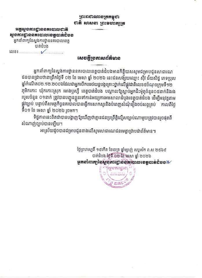 អ្នកនាំពាក្យនៃស្នងការដ្ឋាននគរបាលខេត្តបាត់ដំបង បានឱ្យដឹងថា នាព្រឹកថ្ងៃទី០២ ខែមេសា ឆ្នាំ២០២៦ នេះ ជនសង្ស័យឈ្មោះ ស៊ីវ ជ័យសិដ្ឋ ភេទប្រុស ឆ្នាំកំណើត ០២.១២.២០០៦ ដែលជាអ្នកបើកបររថយន្តបង្កគ្រោះថ្នាក់លើផ្លូវជាតិលេខ៥ ចំណុចក្រុមទី១២ ភូមិកកោះ ឃុំកកោះស្រុក មោងឫស្សី ខេត្តបាត់ដំបង បណ្តាលឱ្យស្លាប់អ្នកជិះម៉ូតូចំនួន ០៥នាក់ និងរងរបួសចំនួន ០១នាក់ ត្រូវបានបញ្ជូនខ្លួនទៅកាន់អយ្យការអមសាលាដំបូងខេត្តបាត់ដំបងតាមផ្លូវច្បាប់ បន្ទាប់ពីសមត្ថកិច្ចនគរបាលបានធ្វើការសាកសួរ និងបំពេញសំណុំរឿងចប់សព្វគ្រប់ កាលពីថ្ងៃទី០១ ខែមេសា ឆ្នាំ២០២៦ រួចមក។