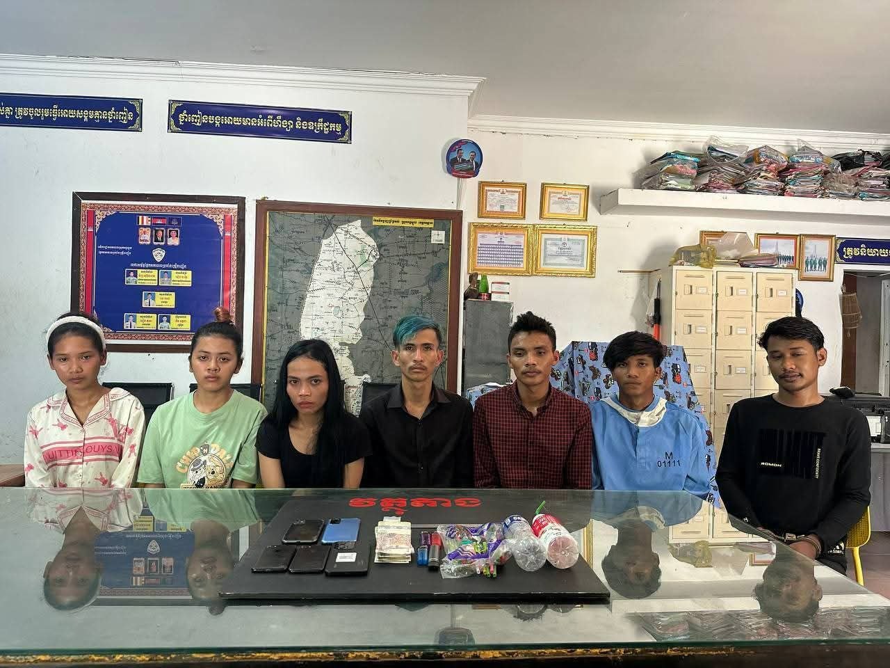 លោកវរសេនីយ៍ឯក មាន សំណាង អធិការនគរបាលស្រុកអង្គស្នួល បានឲ្យដឹងថា ជនសង្ស័យដែលត្រូវឃាត់ខ្លួនសរុបមាន ៧នាក់ (ស្រី ៣នាក់) ក្នុងនោះមានម្ចាស់បន្ទប់ឈ្មោះ សឿន ដេវីត (ប្រុស, ២៥ឆ្នាំ) ជាអ្នកជួញដូរផ្ទាល់ និងធ្លាប់ជាប់ពន្ធនាគារ ២ឆ្នាំ៦ខែ ពីបទគ្រឿងញៀន។ ចំណែកជនសង្ស័យ ៦នាក់ទៀត រួមមានឈ្មោះ សន ថា (ប្រុស, ២២ឆ្នាំ) ឈ្មោះ ឃី សុខណែត (ប្រុស, ២៣ឆ្នាំ) ឈ្មោះ សុខ វិសាល (ប្រុស, ២៣ឆ្នាំ) ឈ្មោះ ង៉ែត ស្រីនុត (ស្រី, ២៤ឆ្នាំ) ឈ្មោះ ជៃ សុភ័ណ្ឌ (ស្រី, ២០ឆ្នាំ) និងឈ្មោះ អឿន ឡៃអ៊ី (ស្រី, ២៦ឆ្នាំ)។ ដោយឡែកជនសង្ស័យឈ្មោះ តន់ សុហនីន (ប្រុស, ៣០ឆ្នាំ) ដែលជាអ្នកជួញដូរជាមួយគ្នា បានរត់គេចខ្លួន។ វត្ថុតាងដកហូតរួមមាន ថ្នាំញៀន ១កញ្ចប់មធ្យម ទម្ងន់១.១២ក្រាម ប្រាក់ ៣៧០០០រៀល ម៉ូតូហុងដាឌ្រីម ១គ្រឿង និងទូរស័ព្ទដៃ ៥គ្រឿង។