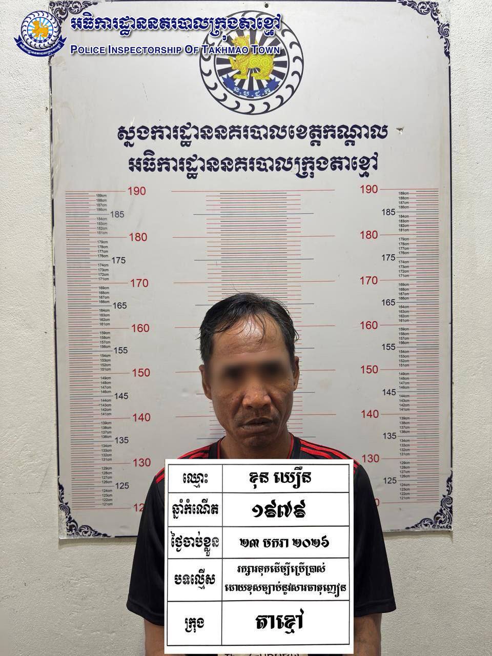 ដោយអនុវត្តតាមបទបញ្ជារបស់ លោកឧត្តមសេនីយ៍ទោ ឈឿន សុចិត្ត ស្នងការ នៃស្នងការដ្ឋាននគរបាលខេត្តកណ្តាល នៅថ្ងៃទី២៣ ខែមករា ឆ្នាំ២០២៦ កម្លាំងនគរបាលនៃអធិការដ្ឋាននគរបាលក្រុងតាខ្មៅ ដឹកនាំបញ្ជាដោយលោកវរសេនីយ៍ឯក យី វណ្ណដា អធិការនគរបាលក្រុងតាខ្មៅ កម្លាំងប៉ុស្តិ៍នគរបាលរដ្ឋបាលស្វាយរលំ ស្រាវជ្រាវឈានដល់ការបង្ក្រាបចំណុចបន្ទប់ជួល ភូមិលេខ២ សង្កាត់ស្វាយរលំ ក្រុងតាខ្មៅ ខេត្តកណ្តាល ឃាត់ខ្លួនជនសង្ស័យចំនួន៣នាក់ ទី១-ឈ្មោះ មឿង ចាន់សុខហេង ភេទប្រុស អាយុ២០ឆ្នាំ សញ្ចាតិខ្មែរ រស់នៅភូមិកំពង់សំណាញ់ សង្កាត់កំពង់សំណាញ់ ក្រុងតាខ្មៅ ខេត្តកណ្តាល ជនសង្ស័យធ្លាប់ជាប់ពន្ធនាគាខេត្តកណ្តាល ចំនួន០១លើក ជាប់រយៈពេល០១ឆ្នាំ ពីបទ ប៉ុនប៉ងលួច ២-ឈ្មោះ ខុន ឃឿន ភេទប្រុស អាយុ៤៧ឆ្នាំ សញ្ជាតិខ្មែរ រស់នៅភូមិតាខ្មៅ សង្កាត់តាខ្មៅ ក្រុងតាខ្មៅ ខេត្តកណ្តាល ជនសង្ស័យធ្លាប់ជាប់ពន្ធនាគារខេត្តកណ្តាលចំនួន០២លើក លើកទី១ ជាប់រយៈពេល០១ឆ្នាំ ពីបទ អំពើលួចទូរស័ព្ទ លើកទី២ ជាប់រយៈ០៨ខែ ពីបទ អំពើលួច ៣-ឈ្មោះ ឈុំ ស្រីនាថ ភេទស្រី អាយុ៣១ឆ្នាំ ជនជាតិខ្មែរ សញ្ជាតិខ្មែរ រស់នៅភូមិលេខ២ សង្កាត់ស្វាយរលំ ក្រុងតាខ្មៅ ខេត្តកណ្តាល ជនសង្ស័យទាំង៣នាក់ មានមុខរបរ មិនពិតប្រាកដ និងមានវិជ្ជមានសារធាតុញៀន (+) ។